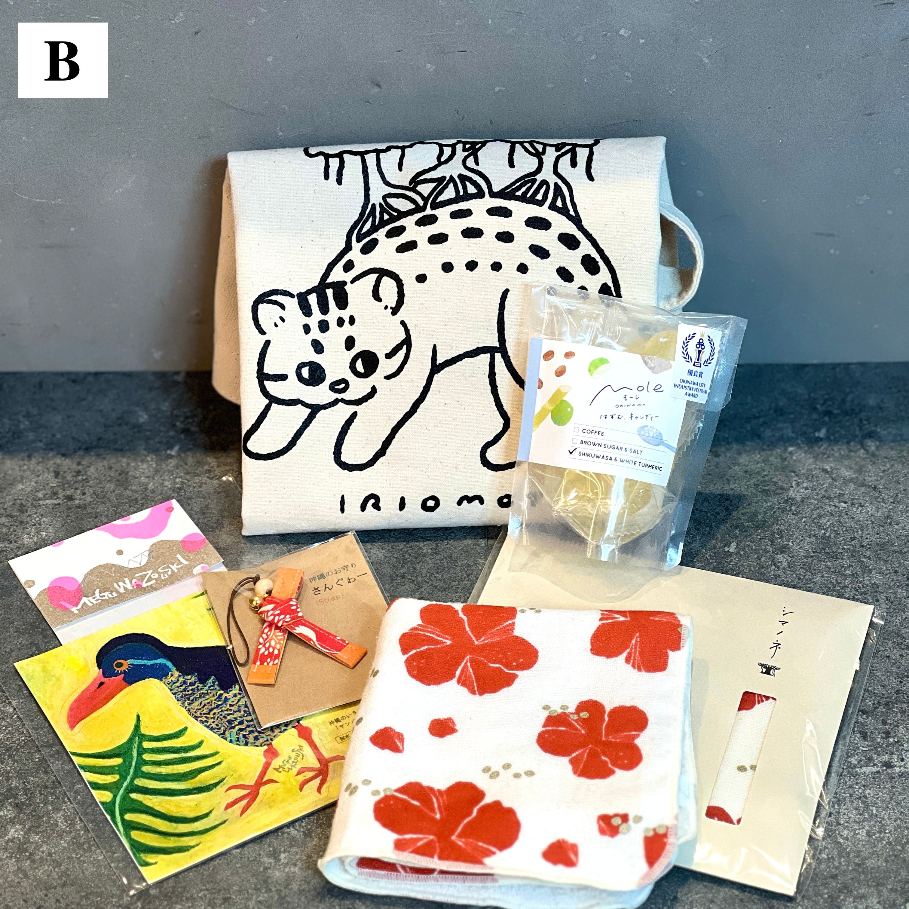 可愛らしいイリオモテヤマネコのトートバッグにお守りのさんぐゎーをつけて、ハイビスカスのハンカチとシークヮーサーのキャンディを入れたら晴れた日にお出かけしたくなること間違いなし!